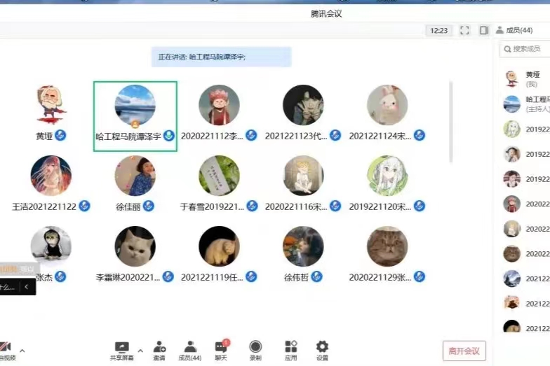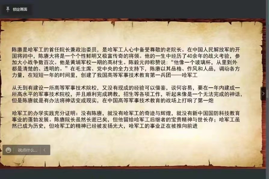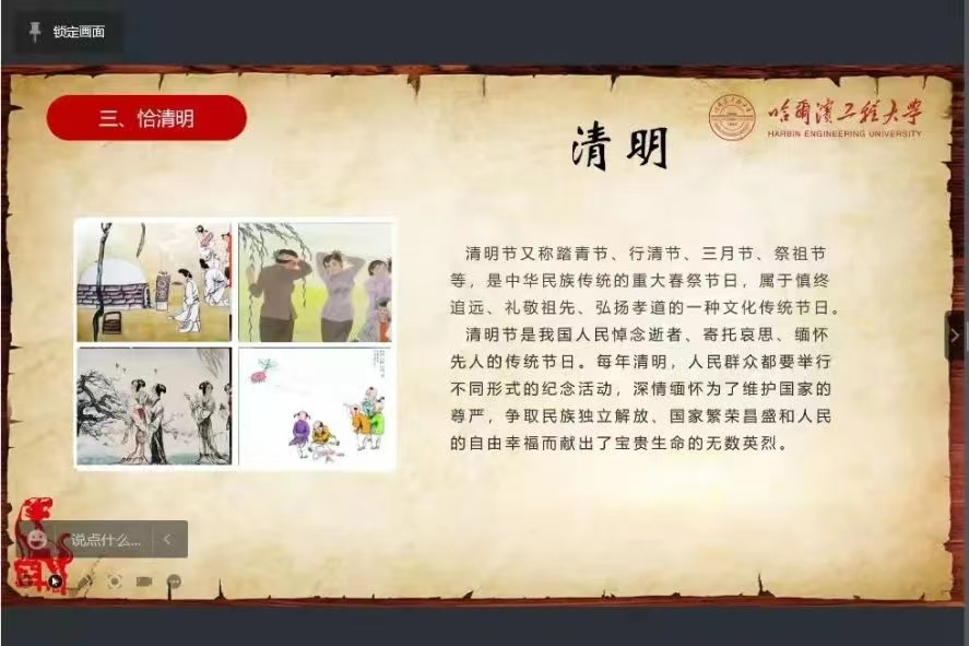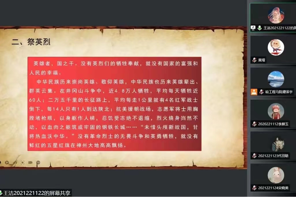 实践部主讲人王洁从“忆往昔”、“祭英烈”和“恰清明”三个部分进行讲述,先从工程学子熟知的陈赓大将与哈军工的故事入手,将同学们带入往昔峥嵘岁月,唤起同学们对英雄的追思,随后重点讲述了赵一曼女士反满抗日、不畏牺牲的事迹,最后进行总结和呼吁。疫情能阻隔同学们去纪念馆实地参观感悟的脚步,却不能阻隔对英烈的无限崇敬与追思。同学们通过主讲人的讲述,在英雄的故事中感受历史的重量,感受精神的洗礼。